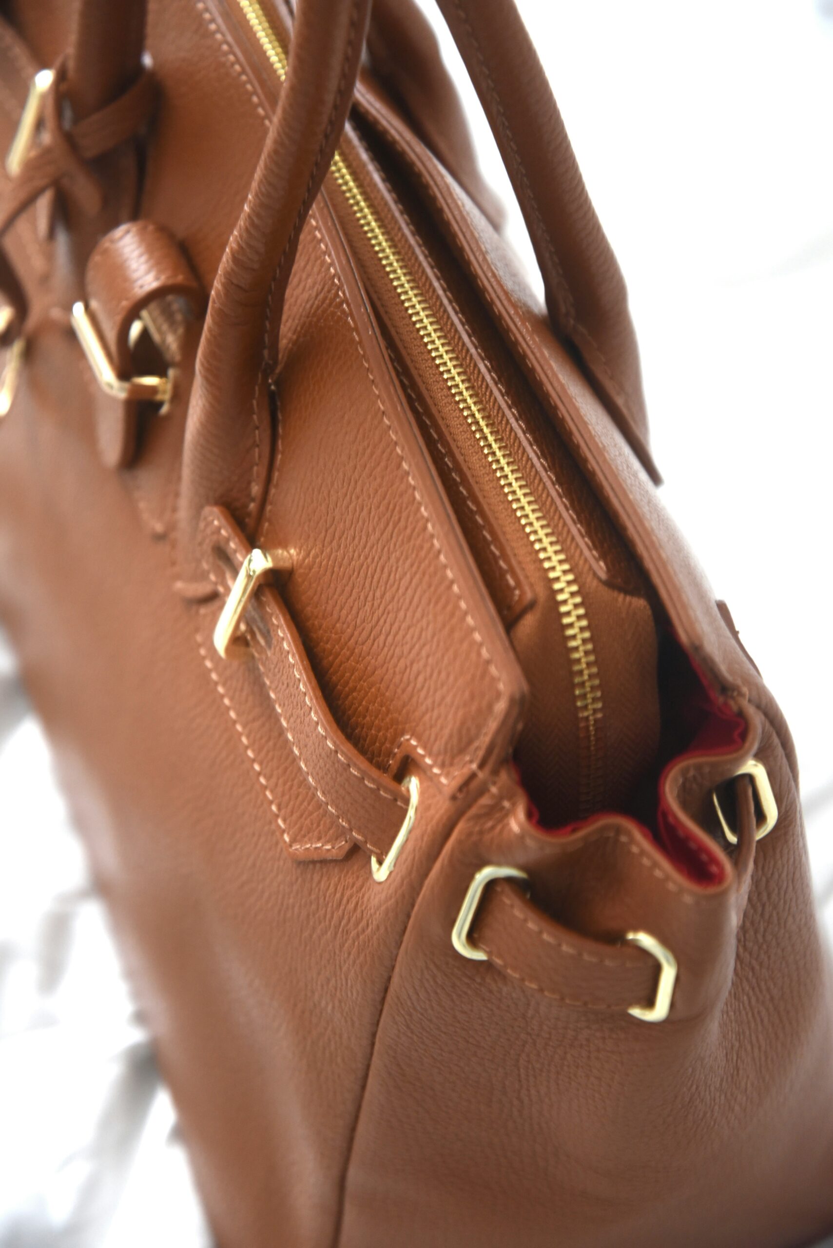 Structured tan leather handbag with gold zip and hardware.